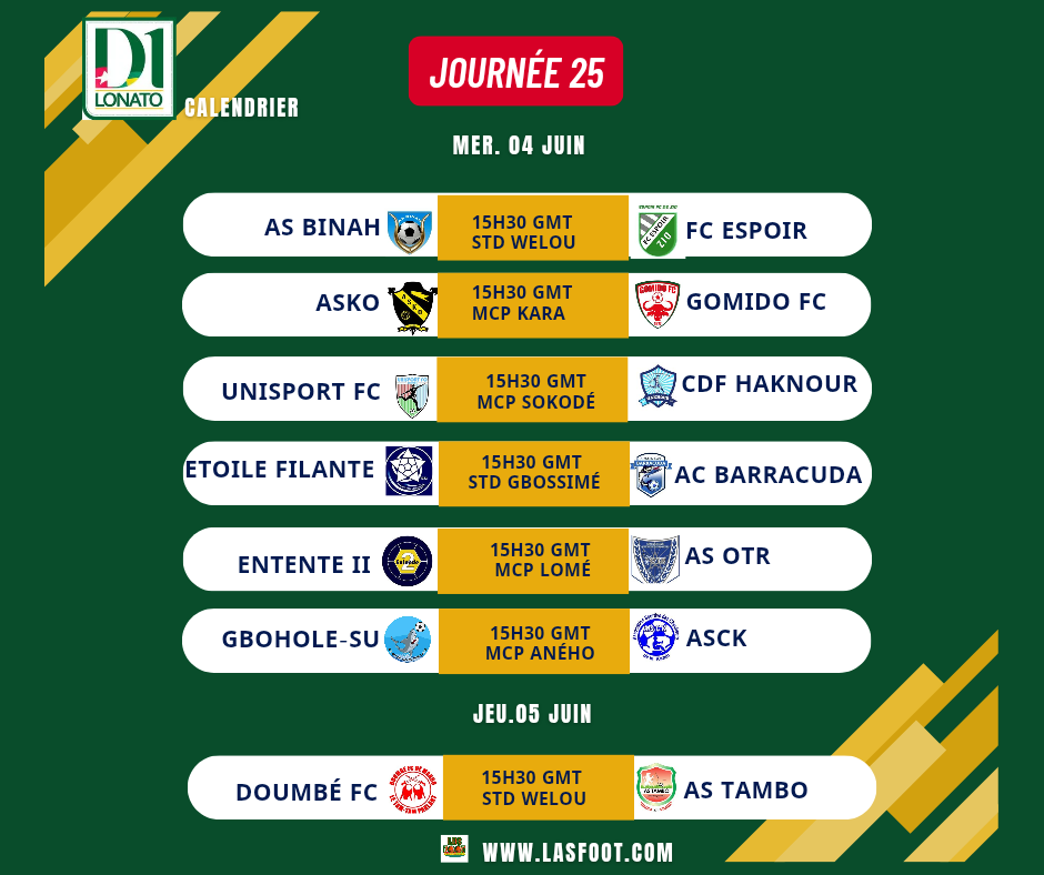 Cette saison 2024/2025 la lecture sur les courbes pour le champion se fera à la dernière minute de la dernière journée : qui de l’ Association Sportive des Chauffeurs de la KOZAH (ASCK ), de l’ Association Sportive de l’Office Togolaise des Recettes (AS OTR) ou de l’ Association Sportive GBOHOLE-SU brandira le fallon du Champion de la D1 LONATO 2024/2025 ce weekend ? La réponse sera probablement connue au terme à la 26e journée. Mais aussi quel club entre le CDF HAKNOUR, l’Etoile filante de Lomé et l’AC BARRACUDA suivra Doumbé FC de Mango pour la relégation en D2?