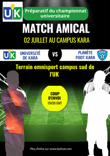 Dans le cadre des préparations du championnat national universitaire 2025, les deux équipes de football de l’université de Kara (masculine et féminine)vont livrer chacune des matchs amicaux. A cet effet, les garçons de l’université de kara accueillent ce mercredi 2 juillet au terrain omnisport du campus sud de l’UK l’académie Planète foot kara à partir de 15h30. Mais bien avant cette rencontre, les filles de l’université offrent leur hospitalité à la sélection féminine de l’académie Dylan FC féminine de Kara à partir de 14h30.